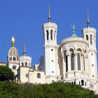 La basilique de Notre-Dame de Fourvière domine la ville de Lyon depuis le sommet de la colline de Fourvière, sur l’emplacement de l’ancien Forum de Trajan.