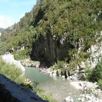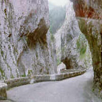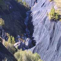 Entre les hautes parois rocheuses, les eaux agitées du torrent s’engouffrent. Il y a 30 millions d’années, un bouleversement géologique a provoqué une formidable cassure verticale appelée « clue ». Les stries (traits) verticales sont dues au renversement des roches.