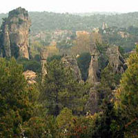 les parois et les aiguilles rocheuses se dressent au-dessus des hêtres et des chênes vert